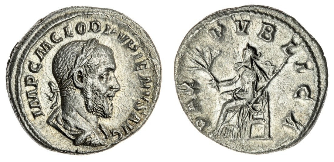 The Hanlon Collection | Roman Empire Pupienus, 238AD, AR Denarius, 238AD, Bust laureate, draped, cuirassed r. rev Pax seated l. holding branch and transverse scepter 3.30g, (BM-46 ; C-22 (10 Fr.) ; RIC-4) well struck, on lustrous flan, sharp details, rev struck from worn dies nEF