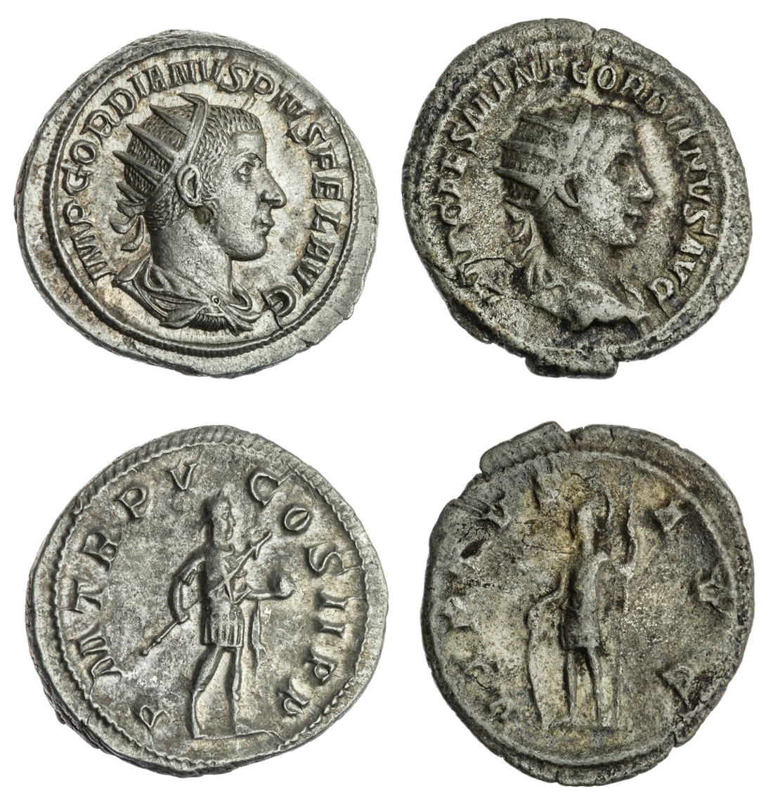 The Hanlon Collection | Roman Empire Gordian III, 238-244AD, AR Antoninianus, (2), Bust of Gordian III r. , Radiate & Draped (both), rev ( I ) ; Gordian In Military dress r. , Globe in left hand, Transverse spear in right. 5.18g, (RIC 93) ; ( II ) ; Virtus stg L. , holding spear & shield, 3.11g, (RIC IV 6 ; RSC 381), the first plugged to bust, nonetheless toned, practically extremely fine, the second fair to fine (2)