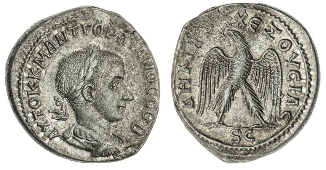 The Hanlon Collection | Roman Empire, Gordian III, 238-244AD, BI Tetradrachm, Bust of Gordian III, to right, laureate, cuirassed, wearing paludamentum, rev, Eagle facing, head to the left, wings outstretched, holding a wreath in its beak, SC In exergue, 12.58g, (BMC Greek 497 ; Prieur 282 ; CP 1050) well struck in high relief, sharp details, lustrous flan, EF