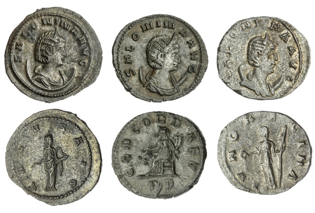 The Hanlon Collection | Roman Empire, Salonina, wife of Gallienus, AR Antoninianus, (3) diademed and draped bust to right, set on crescent, rev ( i ) Salus standing facing, head right, feeding serpent in right arm from patera in left hand, 2.99g (RIC V.II (Gallienus) 88 (Asia) ) ; ( ii ) Concordia seated left, holding patera and double cornucopiae. 3.99g (MIR 542p) ; ( iii ) Juno standing to left, holding patera and sceptre, 2.55g (RIC V 29 ; MIR 36, 227b ; RSC 60.), all with faintly pitted surfaces, yet toned, very fine (3)