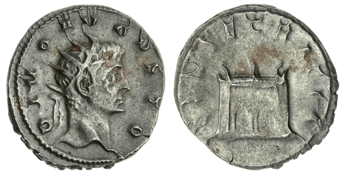 The Hanlon Collection | Roman Empire, Trajan Decius, 249-251AD ,AR Antoninianus, 250-251AD, Head of Divus Augustus, radiate, right, DIVO AVGVSTO, rev, Rectangular altar, with four panels in front, lit, CONSECRATIO, 3.45g, (RIC IV.3 78) dark toning, struck from worn dies, F