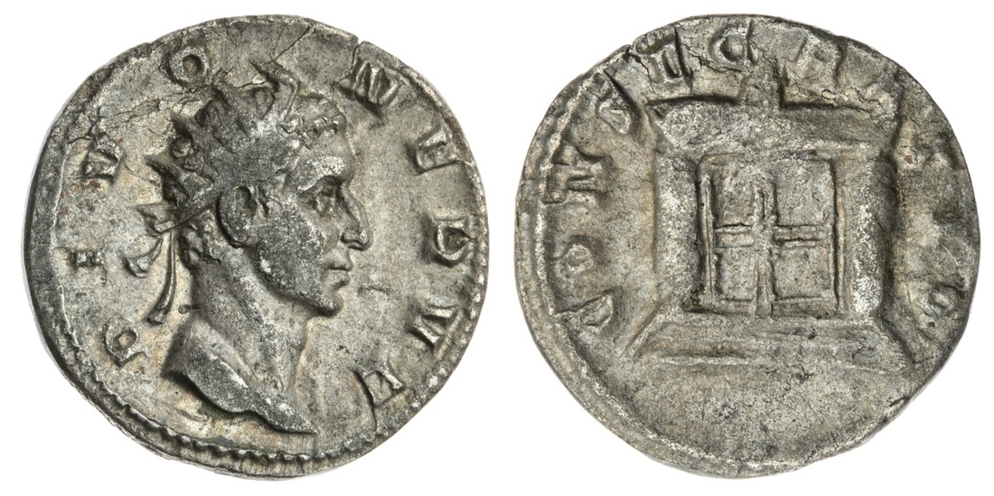 The Hanlon Collection | Roman Empire, Trajan Decius, 249-251AD, Commemorative issue for Divus Nerva, Radiate bust of nerva right, rev Lit altar with two doors, 3.02g, (Cohen 153 ; RIC 84b) slight wear, porosity to coin, dull grey toning, nVF