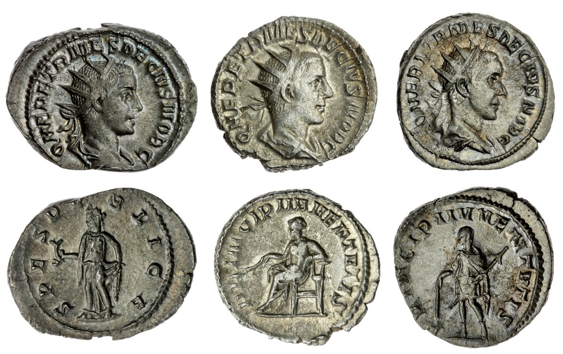 The Hanlon Collection | Roman Empire, Herrenius Etruscus, as Caesar, 251AD, AR Antoninianus, (3) Radiate draped bust r. , rev ( i ) Apollo seated left, holding branch and resting left elbow on lyre, 3.83g, (RIC IV 146 (Decius); RSC 24a.) ; ( ii ) Spes advancing left, holding flower, lifting skirt, 4.60g (S.9526 ; RIC 149 ; RSC 38) ; ( iii ) standing to left carrying staff and spear, 4.94g, (RIC 147c), all toned, good very fine (3)