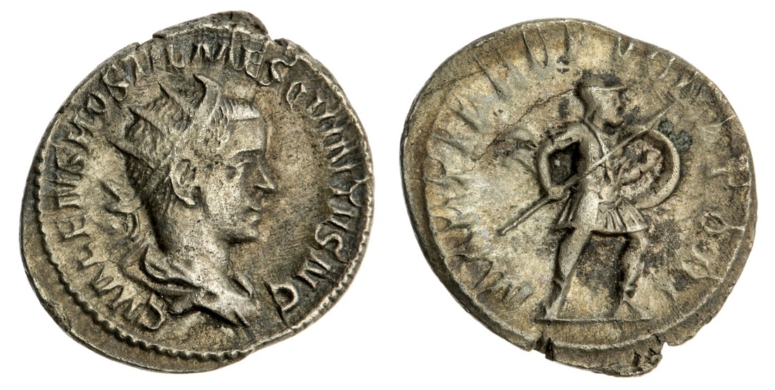 The Hanlon Collection | Gallic Empire, Hostilian, 251AD, AR Antoninianus, Radiate and draped bust r. rev Mars advancing right, holding spear and shield, 2.93g, (RIC 177b) struck on broad flan, porous, toned, spot of verdigris to reverse, VF