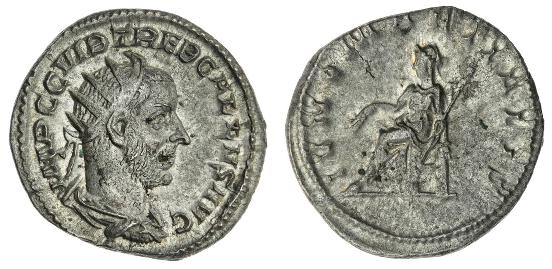 The Hanlon Collection | Roman Empire, Trebonianus Gallus, 251-253AD, AR Antoninianus, Radiate, draped and cuirassed bust to right, rev Juno seated to left, holding corn-ears and sceptre, 3.63g, (RIC IV 69 ; RSC 46) struck on broad flan, touches of verdigris, sharp details, nEF