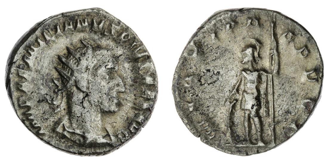 The Hanlon Collection | Roman Empire Aemilian, 252-53AD, AR Antoninianus, Radiate, draped, and cuirassed bust right rev Mars standing left, leaning on shield and holding reversed spear. 3.49g, (RIC IV 6 ; RSC 25.) toned, fairly worn, porous, F