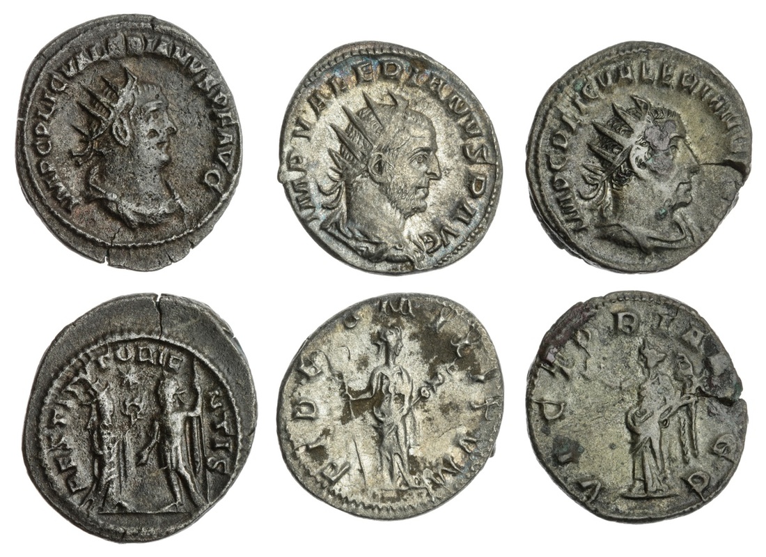 The Hanlon Collection | Roman Empire, Valerian I, 253-260AD, AR Antoninianus (3), Radiate and draped bust r. rev ( i ) Victory standing to left, holding wreath and palm, 3.75g, (RIC V.1 125 ; MIR 30d ; RSC 230) ; ( ii ) the Orient, turreted, standing right, presenting wreath to emperor standing left, holding spear; star above, 3.46g, (RIC 287 ; C. 189 ; MIR 1700q) ; ( iii ) Fides stg. facing r. with vexillum and standard, 2.85g, (Spink-9939 var. ; Ric-240), some pitted marks and verdigris, very fine (3)