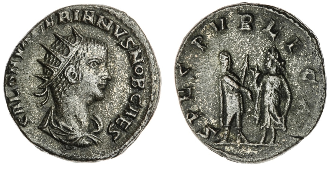 The Hanlon Collection | Roman Empire, Saloninus, As Caesar, 258-260AD, AR Antoninianus, Saloninus, radiate and draped, right, rev Spes standing left, raising hem of skirt and presenting flower to Saloninus standing right in uniform, holding spear, 3.89g, (RIC 36 ; MIR 1696d ; RSC 95) toned, porosity to surface, sharp details, VF