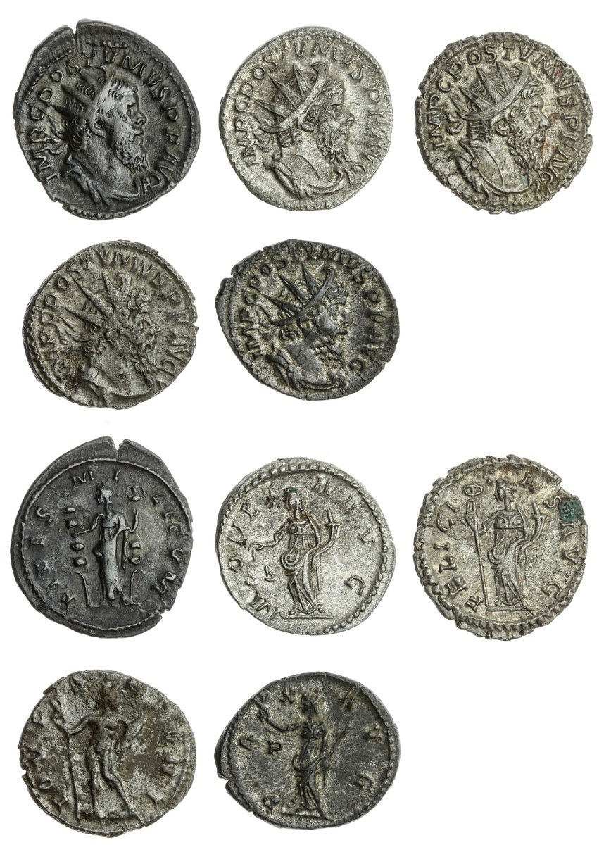 The Hanlon Collection | Gallic Empire, Postumus, 259-268, AR Antoninianus, (5), Radiate, draped and cuirassed bust r. rev ( i ) Felicitas standing to left, holding caduceus and cornucopiae. 3.12g, (RIC V.2 58 (Lugdunum) ; Elmer 335 ; RSC 39a) ; ( ii ) Fides stg. left, holding 2 standards, 2.97g, (RCV III #10940) ; ( iii ) Pax walking to left, holding olive branch and sceptre; P in left field, 2.76g, (RIC V.2 318 ; Elmer 566 ; RSC 215b ) ; ( iv) ) Moneta standing to left, holding scales and cornucopiae, 3.68g, (RIC V.2 75 (Lugdunum) ; Elmer 336 ; RSC 199a) ; ( V ) Jupiter standing facing, head to right, holding sceptre and thunderbolt. 3.47g, (RIC V.2 309 ; RSC 159a), very fine (5)