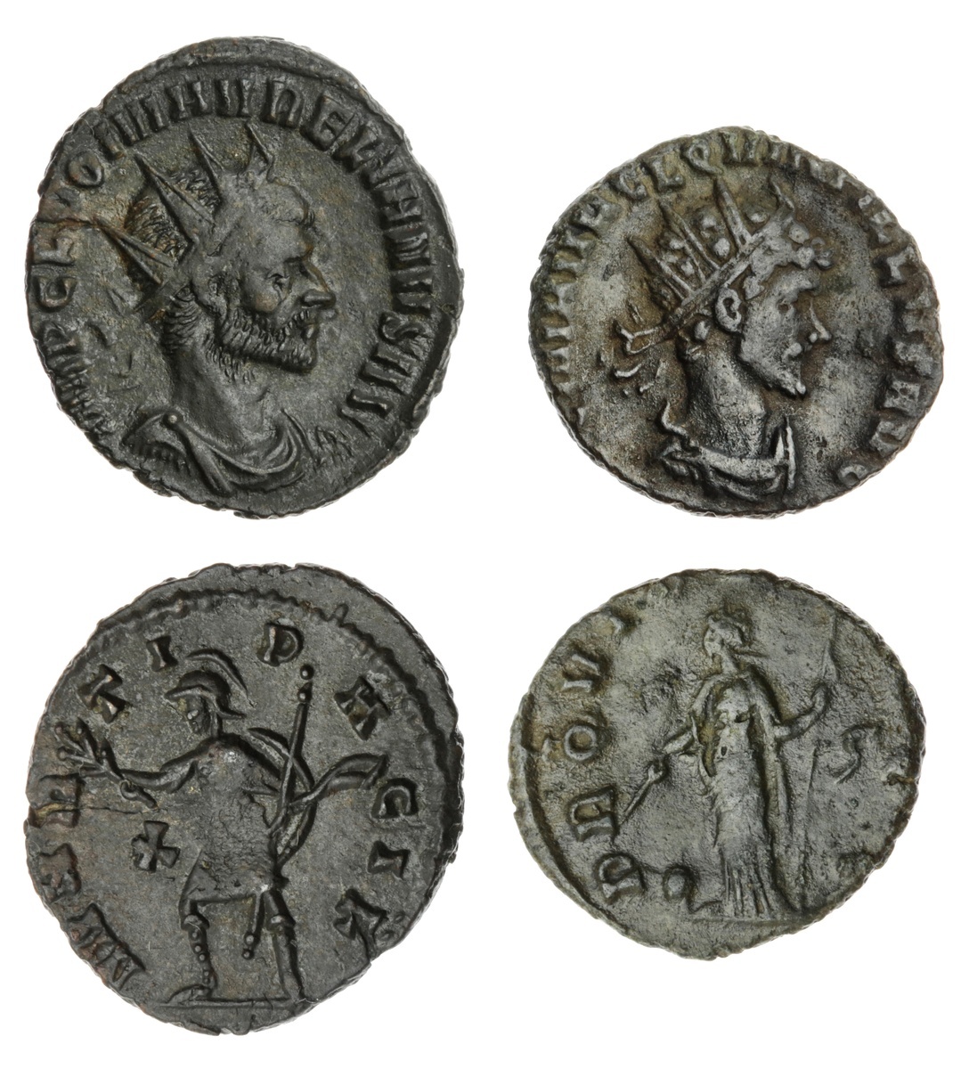 The Hanlon Collection | Roman Empire, Quintillus, 270AD, AE Antoninianus (2), Radiate and draped bust r. rev ( i ) Providentia standing left, holding scepter and wand; globe at feet to left, 2.28g, (RIC V 28 ; Cunetio 2339) ; ( ii ) Mars walking to left, holding branch, spear and shield; X in left field, 2.78g , (RIC V.1 24), the first good fine, the second very fine (2)