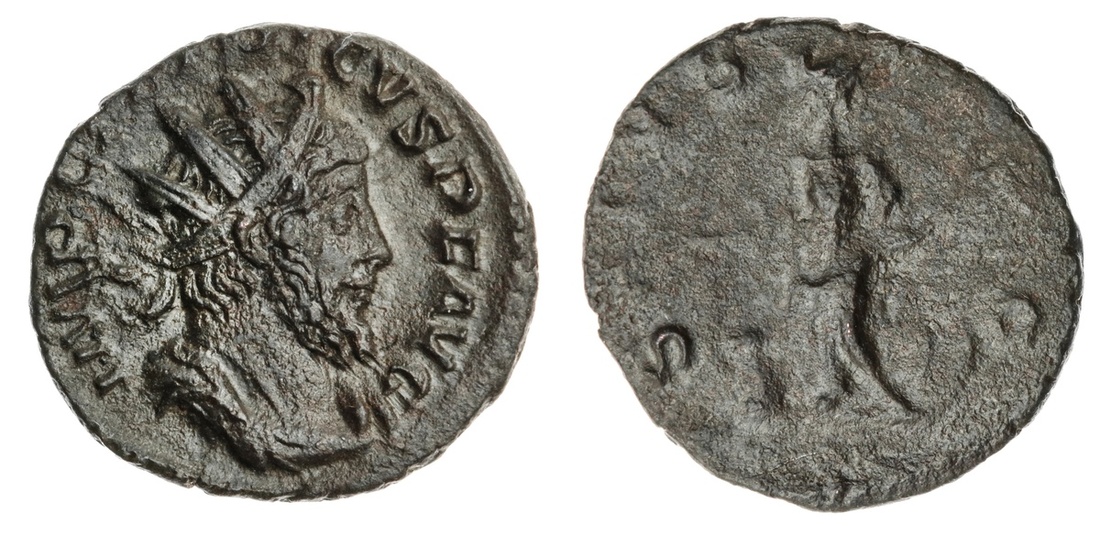 The Hanlon Collection | Roman Empire Tetricus I, 270-273AD, Radiate and Draped bust right, rev Salus feeding snake out of patera, altar right, by feet, corn ears in left hand, 2.62g, (C.154 ; RIC.126 ; E.779) rev struck from worn dies, obv sharp, F