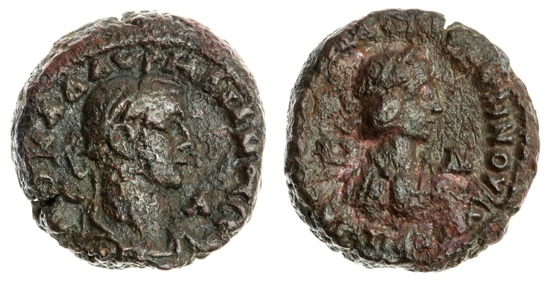 The Hanlon Collection | Roman Empire , Vabalathus, 270-275, Tetradrachm, 270-271, Laureate, draped and cuirassed bust of Aurelian r.; in field, L-A,rev, Laureate, draped and cuirassed bust of Vabalathus; in field, L- A, 8.81g, (Dattari 5422 ; Geissen 3056.) fairly corroded, deposits to surface, G