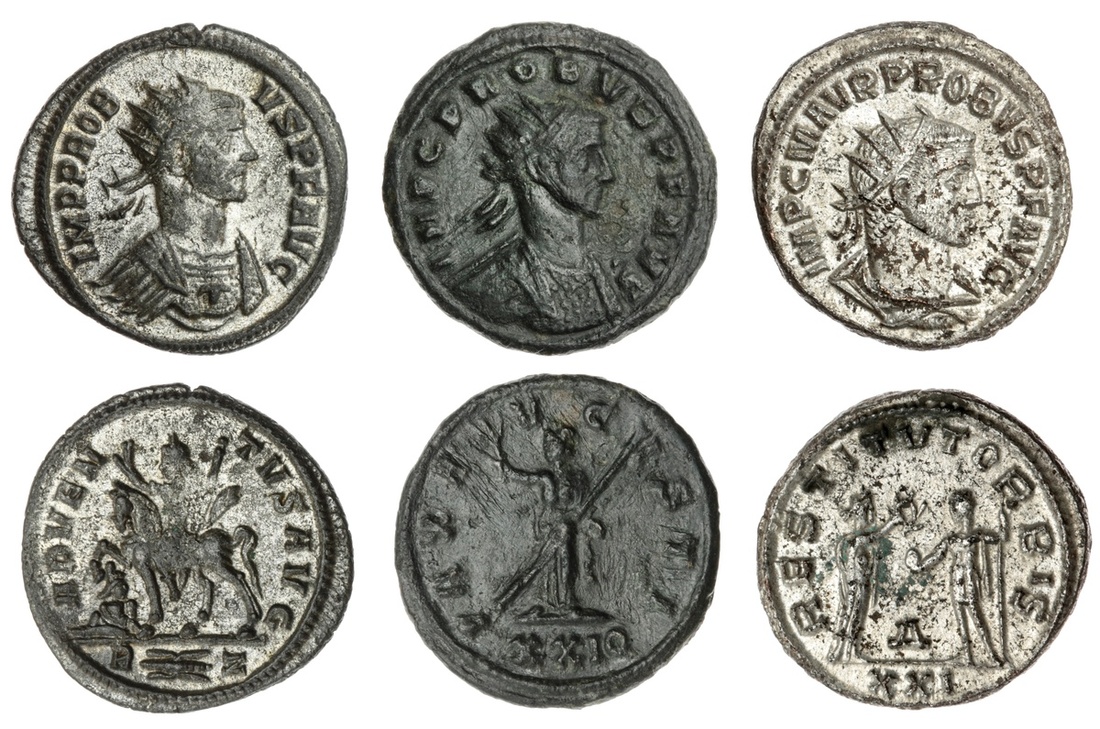 The Hanlon Collection | Roman Empire Probus, 276-282AD, AE Antoninianus, ( 3 ) Radiate draped & cuirassed bust r. rev ; ( I ) Probus on horseback to left, about to spear fallen enemy, R (thunderbolt) Z in exergue 3.46g, (RIC 155) ; ( II ) Emperor stg on right, facing left, globe in right hand, scepter in left, opposite, Victoria presenting him with wreath, XXI in exergue, 4.17g, (C.509 ; RIC.925 F ; RCV.12021) ; ( III ) Pax standing facing, head to left, holding olive branch and sceptre; XXIQ in exergue. (RIC V.2 706.), some rub to surfaces, otherwise very fine (3)