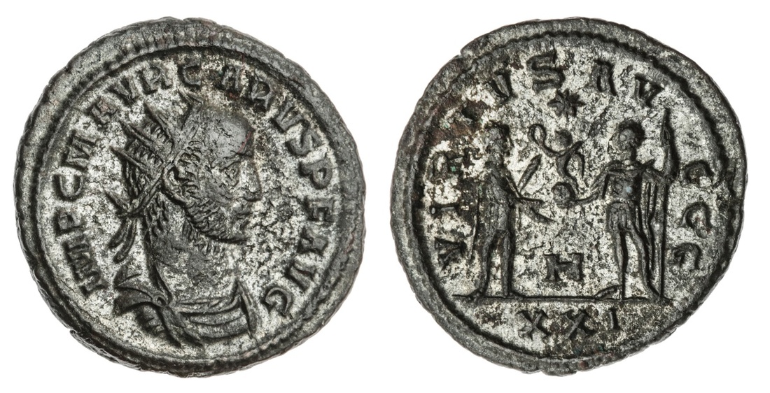 The Hanlon Collection | Roman Empire, Carus, 282-283AD, AE Antoninianus, Radiate & Draped bust r. rev Carus stg. r. recieving victory on globe from jupiter, stg. left, H between, XXI in exergue, 3.85g, (RIC V 124 corr. (mint) ; Pink VI/2, p. 43.) Dark toning, some original silvering remaining, nVF