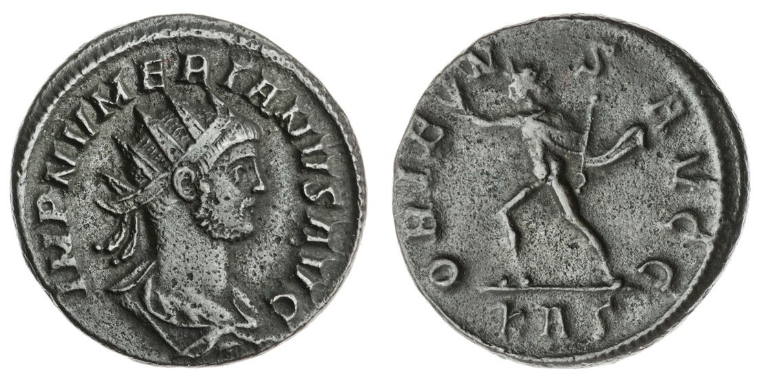 The Hanlon Collection | Roman Empire, Numerian, 283-284AD, AE Antoninianus, Radiate and draped bust r. rev Sol advancing left, raising right hand and holding whip in his left. KAS in exergue, 3.76g, ( C.37 ; RIC.412 ) dark toning, sharp details, VF