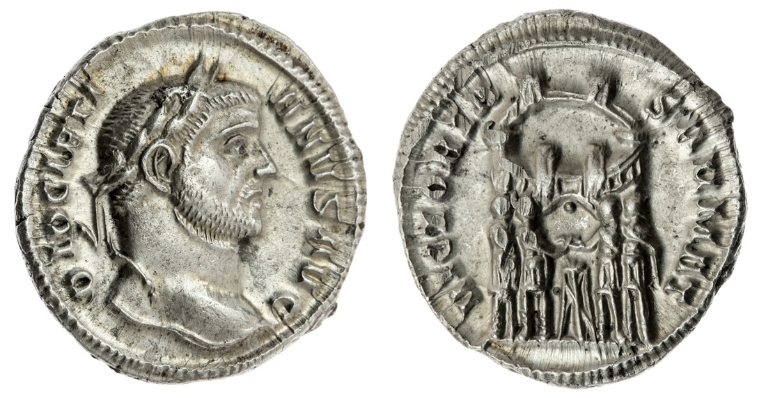 The Hanlon Collection | Roman Empire Diocletian, 284-305AD, AR Argentius, 295AD, Laureate head r. rev tetrarchs sacrifing over tripod before city enclosure with six turrets, Ticinium mint, 3.19g, (RIC 16a ; Ex Numismatik Naumann 62, 79) struck on lustrous flan, razor sharp details, EF