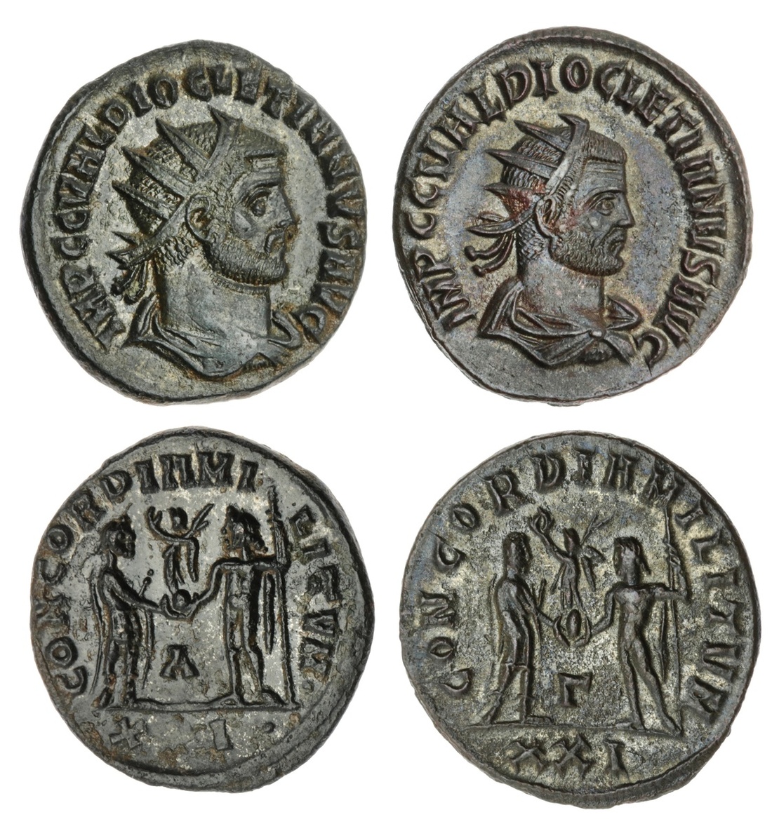 The Hanlon Collection | Roman Empire, Diocletian, 248-305AD, AE Antoninianus, ( 2 ) Radiate & draped bust Left, rev ( I ) Jupiter stg. left, handing Diocletian nikephorean globe with right hand, sceptre in left, A in field, X I in exergue, 3.68g, (RIC.22) ; ( II ) Jupiter stg. left, handing Diocletian nikephorean globe with right hand, sceptre in left, lambda in field, XXI in exergue, 3.18g, ( RIC.22 ), some corrosion to the first, otherwise still both pleasingly struck up, good very fine (2)