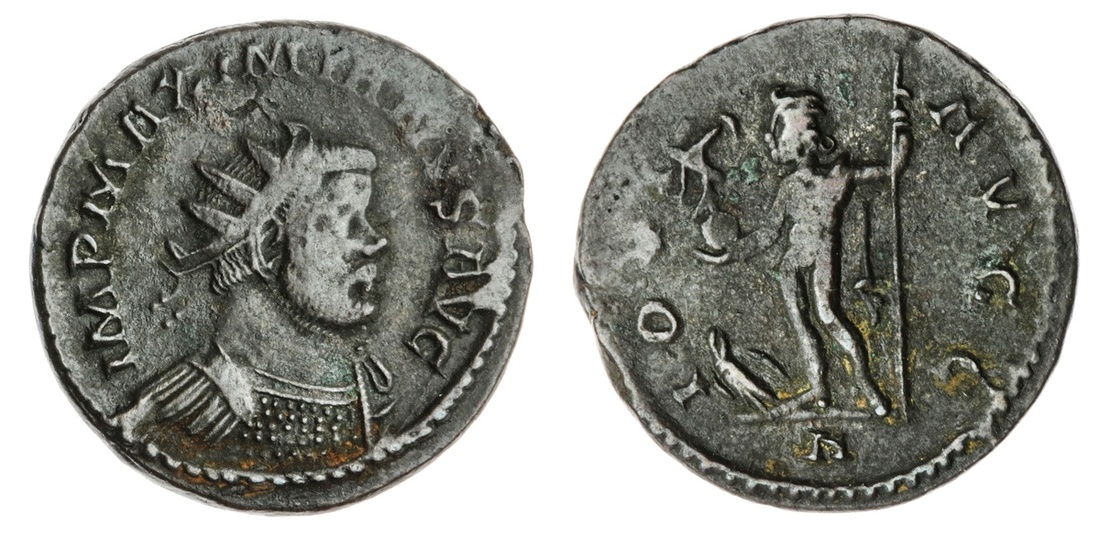 The Hanlon Collection | Roman Empire, Maximinianus, 286-305AD, AE Antoninianus, Radiate and cuirassed bust r. rev Jupiter stg L., nikephorean globe in right hand, sceptre in left, eagle at feet L. N in exergue, 4.07g, ( Bastien 338 ; RIC 384 ) dark patina, good details, fairly worn, VF