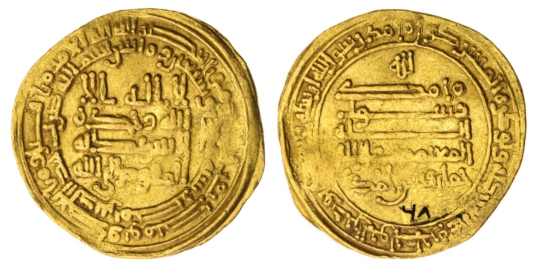 Tulunid, Kumarawayh bin Ahmad (884-96), gold Dinar, 4.21g, Misr, AH271, naming Caliph al-Mu'tamid and heir al-Mufawwidh (A 664.1; Bernardi 193De), with numeral '68' engraved below reverse legend, once mounted, good fine