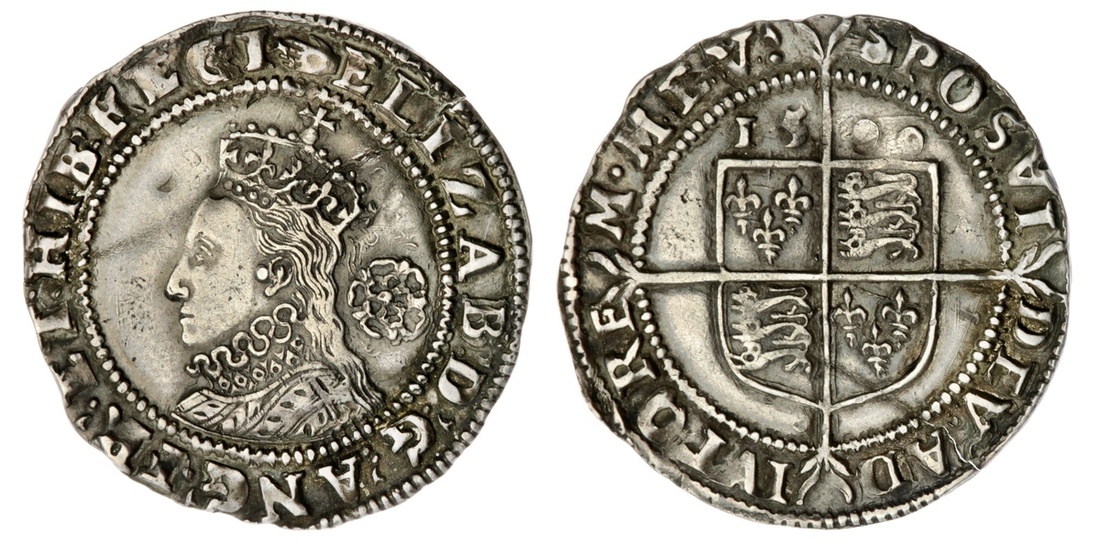 Elizabeth I (1558-1603), Sixth Issue, Sixpence, 1590, bust 6C, crowned left, rose behind, rev. square-topped shield over cross fourchée, 3.02g, 6h, m.m hand (North 2015; Spink 2578B), flan split at 2 o'clock, leading to crease ending at 9 o'clock, otherwise the legend pleasingly struck up, darkened surfaces, very fine