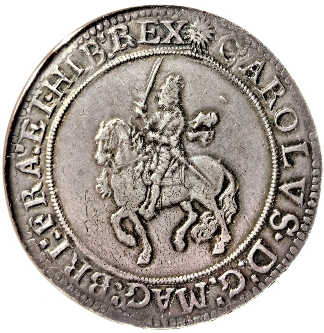 (x) NGC AU55 | Charles I (1625-1649), Group IV, Type 4, Crown, 1645-1646, Tower (under Parliament), (m.m.) CAROLVS • D.' G.' MAG.' BRI.' FRA.' ET • HIB.' REX, fourth foreshortened horseman left, sword upright, no ground line, rev. •:•• (m.m.) •:• CHRISTO • AVSPICE • REGNO, the G double-entered, oval garnished shield, 30.01g, 8h, m.m. sun / sun (Hawkins 4; Francis 40a; FRC XXIV/XXXVII, lot 96; Brooker 272; Barr 43; Boismason 2013; Dr Erik Miller 14; North 2198; Spink 2761), central devices more softly struck on high points, otherwise unimpinged by unsightly metal stresses, with an attractive cabinet tone, a pleasing very fine, the peripheries especially so, the same obverse die as next, in NGC holder, graded AU55 (Cert. #2838013-001)