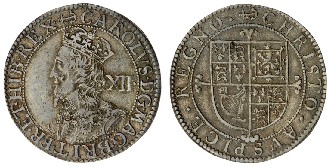 Charles I (1625-1649), Briot's Second Milled Issue, Shilling, 1638-1639, crowned and draped late bust left, with falling lace collar, value behind, rev. square-topped shield over cross moline, 6h, 6.26g, m.m anchor and B (North 2305; Spink 2859), lightly rubbed and hairline going through bust and between IT in BRIT, otherwise toned, very fine