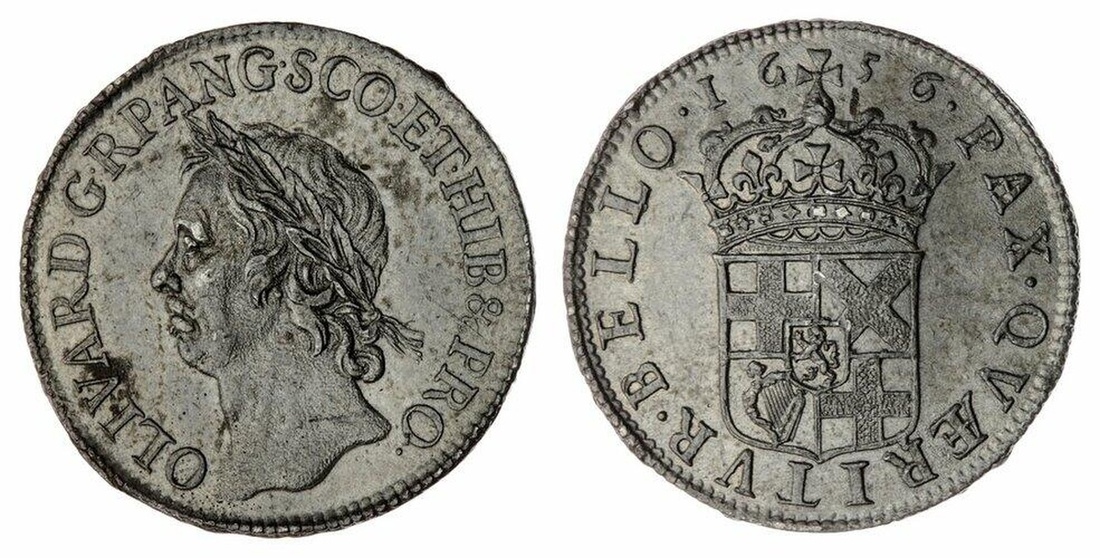 (x) Oliver Cromwell, A Cast or Trial of the Pattern Broad, 1656, in white metal or pewter, after Thomas Simon, laureate head left, rev. crowned shield, edge straight grained, 5.45g, 6h (Lessen A42 this coin; cf. Schneider 367; cf. WR 39; cf. S.3225), slight flan concavity with highly trace evidence of pest and the odd nick to rim, superficial marks in otherwise residually lustrous fields, approaching extremely fine, unusual and very rare