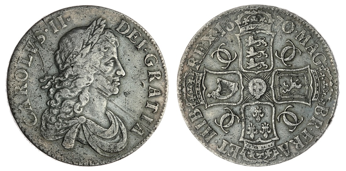Charles II (1660-1685), Crown, 1670 VICESIMO SECVNDO, second bust variety right, rev. crowned cruciform shields, interlinked C's in angles, nine strings to harp, lettered edge downwards, 6h, 29.53g (ESC 40-[R]; Bull 380; Spink 3357), excavated and thus with lightly pitted surfaces, scratched to the obverse, nevertheless darkly toned, bolder very fine and rare