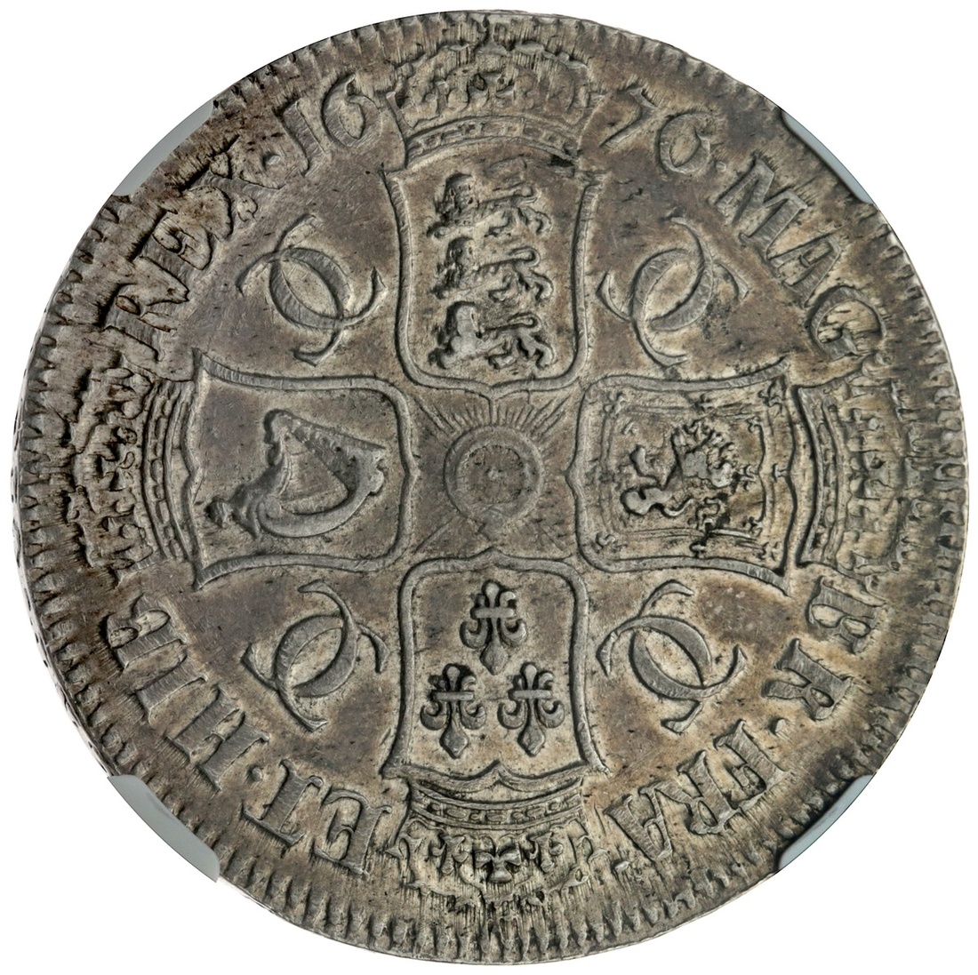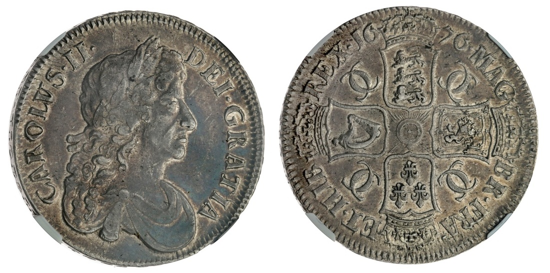 (x) NGC AU55 WINGS | Charles II (1660-1685), Crown, 1676 VICESIMO OCTAVO, third laureate and draped bust right, rev. crowned shields cruciform, six strings to harp, lettered edge upwards, 6h (Bull 397; ESC 51; Spink 3358), lightly wiped and toned with much residual lustre, a handsomely broad and bolder strike, good very fine, in NGC holder, graded AU55 WINGS (Cert. #3728322-006)