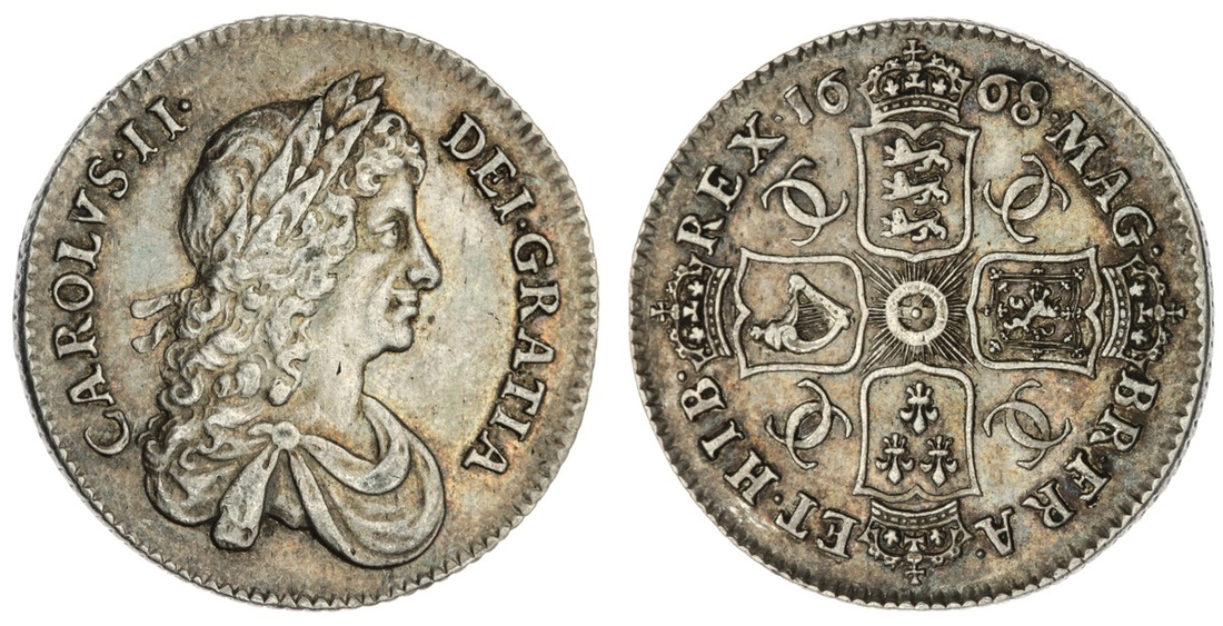 Charles II (1660-1685), Shilling, 1668, 'Small 6s Repunched', second laureate and draped bust right, rev. crowned shields cruciform, eight strings to harp, edge straight milled, 5.93g, 6h (Bull 511; ESC 1030; Spink 3375), lightly toned with a hint of residual lustre, good very fine and without the usual striking weakness