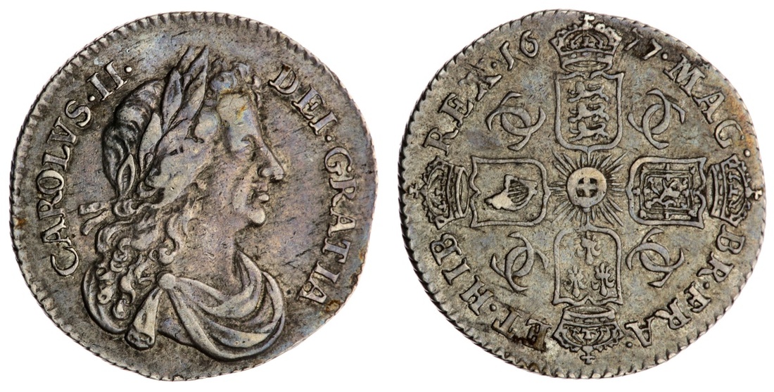Charles II (1660-1685), Sixpence, 1677, laureate and draped bust right, rev. interlinked C's in angles, five strings to harp, obliquely milled edge, 2.85g, 6h (Bull 572; ESC 1516; Spink 3382), struck on an irregular flan with a trace of flecking, otherwise toned, very fine, the reverse better, with no trace of overpunch in MAG