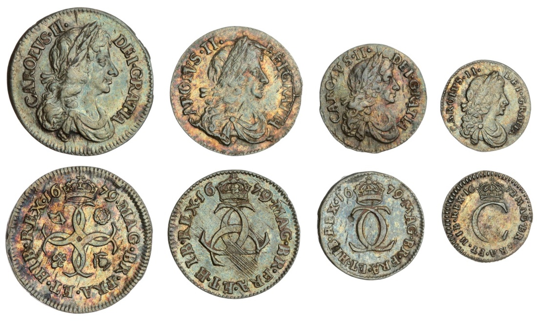 Maundy Coins (4) | Charles II (1660-1685), Fourpence, Threepence and Twopence, 1679; Penny, 1672/1 (ESC 2181; 2173; Bull 690; 678; Spink 3388), adjustment marks to Threepence reverse, otherwise all richly toned and with some lustre, extremely fine (4)