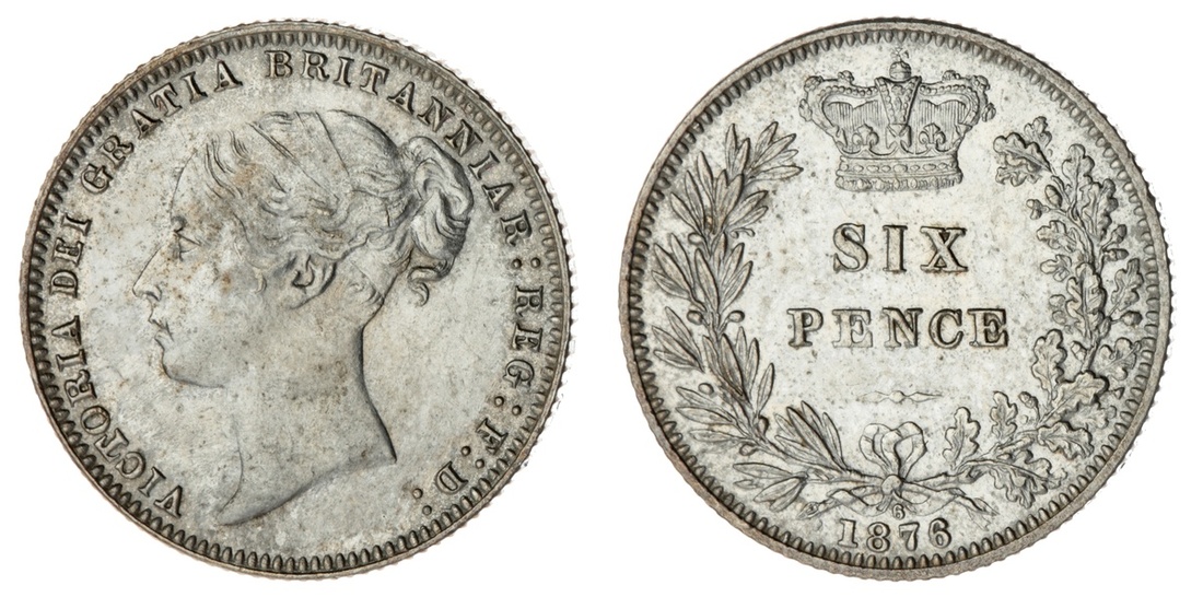 Victoria (1837-1901), Sixpence, 1876, second young head left, rev. crowned denomination within wreath, die number 6, milled edge, 6h, 2.82g (ESC 1730-[R2]; Bull 3231; Spink 3910), patches of toning to obverse, the reverse with some lustre, near extremely fine and very rare