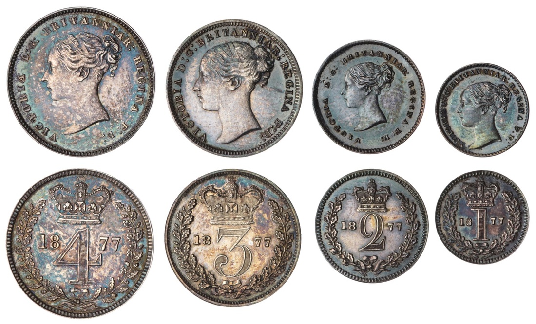 Victoria (1837-1901), 'Young Head' Maundy Set, 1877, young head left, rev. crowned mark of value, edge plain (Bull 3530; ESC 2490; Spink 3916), lustrous and darkly toned with hues of blue, near extremely fine (4)