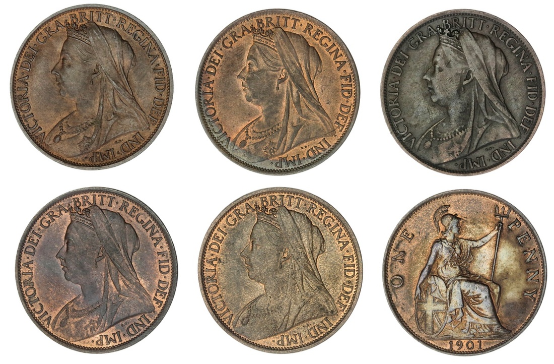 Victoria (1837-1901), Penny (5), 1896; 1898; 1900 (2); 1901 (2), old head left, rev. Britannia seated right, plain edge (Spink 3961), the 1898 fine, the rest with some mint red to surfaces, very fine to extremely fine (5)