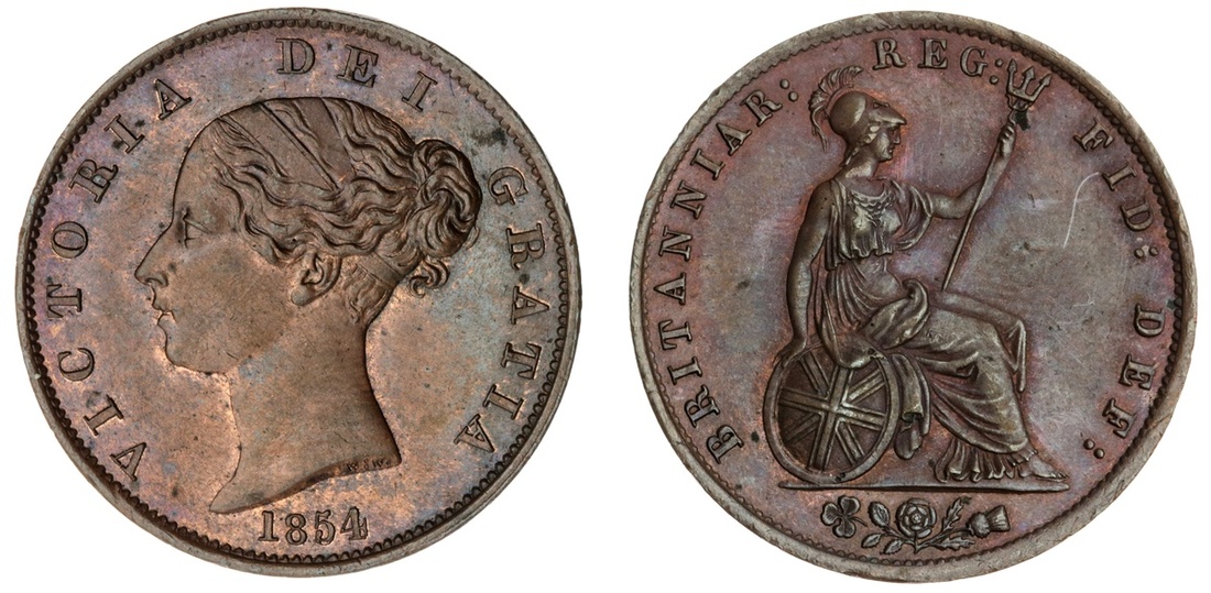 Victoria (1837-1901), Halfpenny, 1854, young head left, rev. Britannia seated right, plain edge, 11h, 9.53g (Spink 3949), toned and with hints of mint red beneath, extremely fine