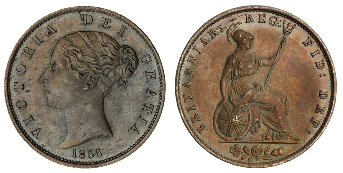 Victoria (1837-1901), Halfpenny, 1856, young head left, rev. Britannia seated right, plain edge, 12h, 9.44g (Spink 3949), die flaw to D of DIE and with speckled surfaces, otherwise with a pleasing lustre and reddish tones to the reverse, good extremely fine