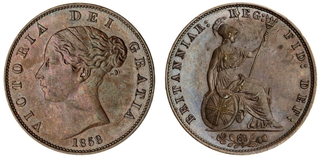 Victoria (1837-1901), Halfpenny, 1858, young head left, rev. Britannia seated right, plain edge, 12h, 9.66g (Spink 3949), some hairline die flaws through legends, otherwise toned and with a residual lustre to otherwise darkened surfaces, extremely fine