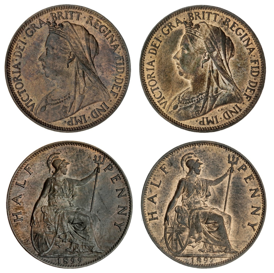 Victoria (1837-1901), Halfpenny, 1897; 1899, old head left, rev. Britannia seated right, plain edge, 12h, 5.83g; 5.65g (Spink 3962), both with areas of original mint red, extremely fine (2)