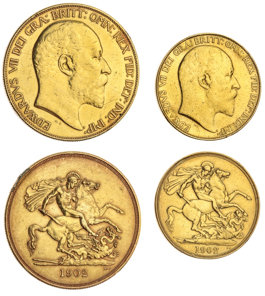 (g) Edward VII (1901-1910), Matte Proof Five-Pounds, 1902, by de Saulles and Pistrucci, bare head right, rev. St George and Dragon, edge milled, 40.01g, 12h (W&R 404; Stratos 206; Spink 3966), scrubbed and scratched, and solder damage at 3 o'clock where removed from mount, otherwise struck details about very fine; additionally, Two-Pounds, 1902, 'Low Date', bare head right, rev. St. George and Dragon, edge milled, 15.64g, 12h (Spink 3967), removed from a mount, heavily sweated and tooled, a poor type coin (2)