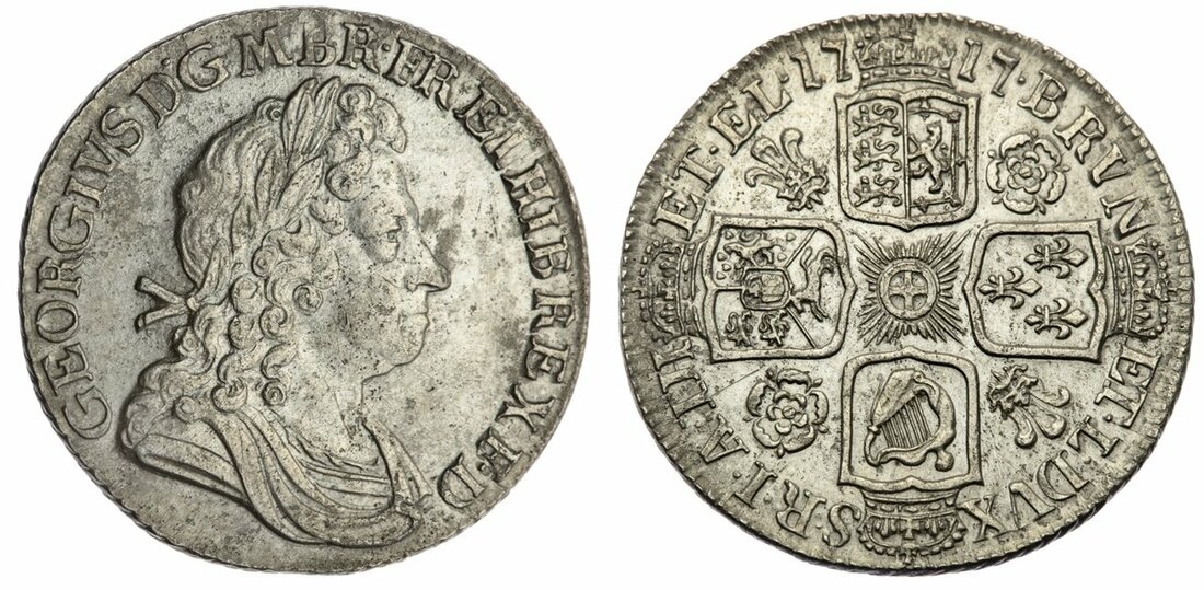 George I (1714-1727), 'Roses and Plumes' Shilling, 1717, first laureate, draped and cuirassed bust right, larger lettering, rev. four crowned shields cruciform, roses and plumes in angles, eight strings to harp, obliquely milled edge, 5.99g, 6h (Pywell-Phillips 269; Bull 1565; ESC 1164; Spink 3645), bright cleaned with some tarnishing behind bust, otherwise struck details almost extremely fine, of dishonest appearance but a a very scarce date, particularly in higher grades