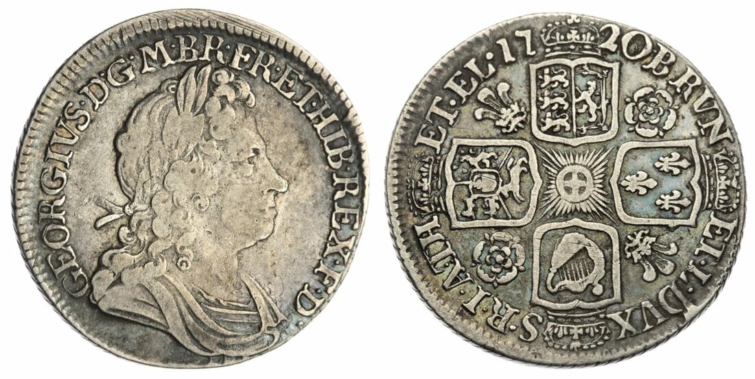 George I (1714-1727), 'Roses and Plumes' Shilling, 1720 over 18, first laureate, draped and cuirassed bust right, rev. four crowned shields cruciform, roses and plumes in angles, seven strings to harp, obliquely milled edge, 5.97g, 5h (Bull 1570 [R4]; ESC 1167A; Spink 3645), struck slightly off-centre [a recurring problem at this time], otherwise lightly toned, a bolder fine, the overdate excessively rare
