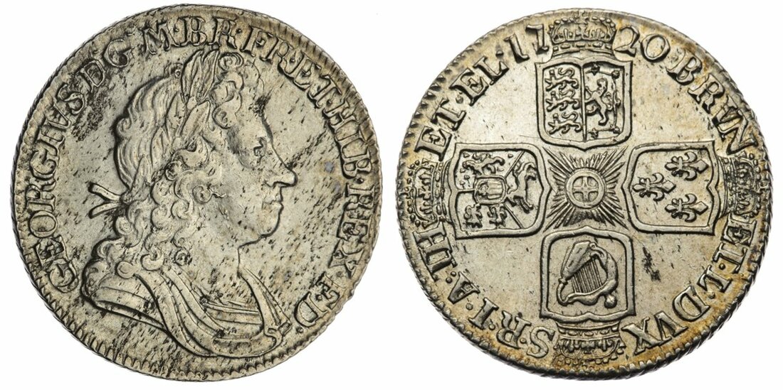 George I (1714-1727), Shilling, 1720, 'Normal 0', first laureate, draped and cuirassed bust right, rev. four crowned shields cruciform, seven strings to harp, angles plain, obliquely milled edge, 6.01g, 6h (Bull 1572; ESC 1168; Spink 3646), cleaned and bright with traces of haymarking, otherwise quite lustrous, a bolder very fine
