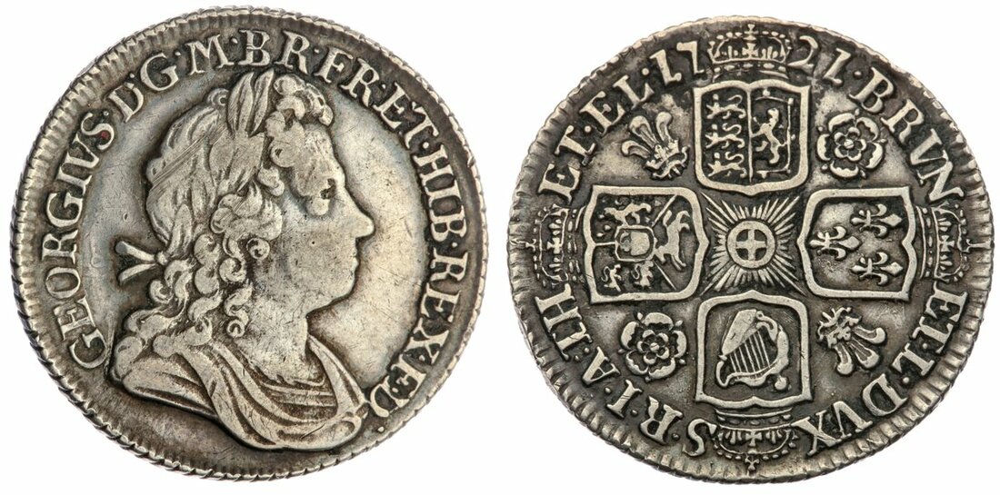 George I (1714-1727), 'Roses and Plumes' Shilling, 1721, first laureate, draped and cuirassed bust right, rev. four crowned shields cruciform, roses and plumes in angles, seven strings to harp, obliquely milled edge, 5.99g, 6h (Bull 1577, seven strings not noted; ESC 1171; Spink 3645), a scuff on hair and lightly cleaned, otherwise a bolder fine