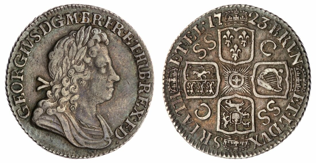 George I (1714-1727), 'South Sea Company' Shilling, 1723, 'French Arms at Date', first laureate, draped and cuirassed bust right, rev. four crowned shields cruciform, SSC in angles, French arms at date, seven strings to harp, obliquely milled edge, 5.94g, 6h (Bull 1589 [R2]; ESC 1177; Spink 3647), lightly toned, a really good fine, rare