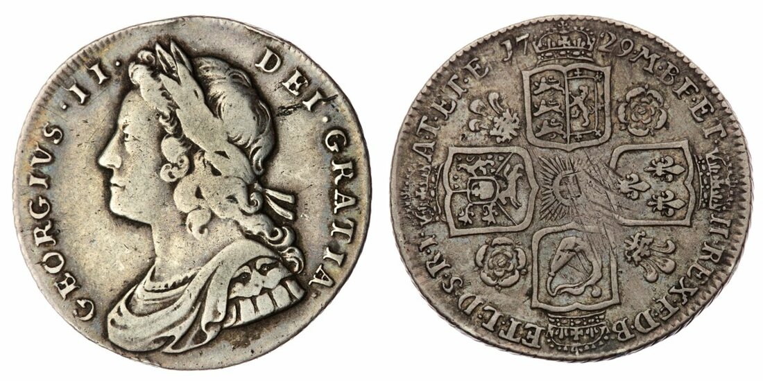 George II (1727-1760), 'Roses and Plumes' Shilling, 1729, normal 9, young laureate, draped and cuirassed bust left, rev. four crowned shields cruciform, double pearls in bands, roses and plumes in angles, eight strings to harp, obliquely milled edge, 5.93g, 6h (Pywell-Phillips 331; Bull 1700 eight strings not noted; ESC 1193; Spink 3698), lightly cleaned in obverse field and flaw to edge behind head, with rougher adjustment marks in the centre of the reverse, otherwise toned, strictly fine / a bolder fine, rare, perhaps rarer than indicated in ESC
