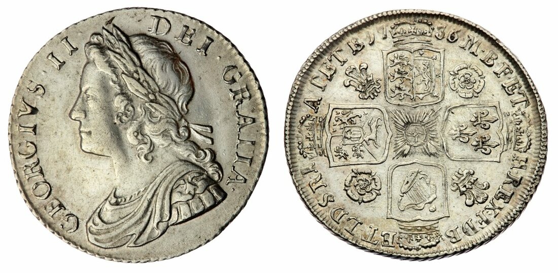 George II (1727-1760), 'Roses and Plumes' Shilling, 1736 over 5, young laureate, draped and cuirassed bust left, rev. four crowned shields cruciform, roses and plumes in angles, nine strings to harp, obliquely milled edge, 5.99g, 6h (Bull 1710 [R2]; ESC 1199A; Spink 3700), polished and bright, otherwise a bolder very fine, the overdate rare