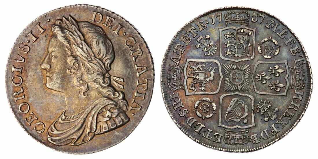 George II (1727-1760), 'Roses and Plumes' Shilling, 1737, young laureate, draped and cuirassed bust left, rev. four crowned shields cruciform, roses and plumes in angles, eight strings to harp, obliquely milled edge, 5.98g, 6h (Pywell-Phillips 337; Bull 1711; ESC 1200; Spink 3700), possibly lightly wiped and retoned accounting for the interspersed unnatural colouration and cabinet 'gunmetalling', otherwise lustrous, a really bold very fine