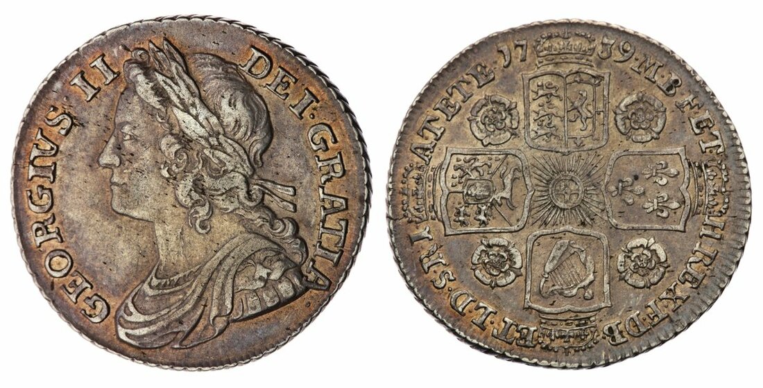 George II (1727-1760), 'Roses' Shilling, 1739, young laureate, draped and cuirassed bust left, rev. four crowned shields cruciform, roses in angles, normal Garter star, eight strings to harp, obliquely milled edge, 6.00g, 6h (Pywell-Phillips 338; Bull 1713; ESC 1201; Spink 3701), lightly flecked with a light grey tone and fiery-lustrous flare in recesses, a pleasing very fine