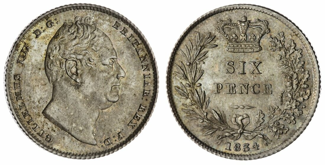 William IV (1830-1837), Sixpence, 1834, bare head right, rev. crowned denomination within wreath, milled edge, 2.82g, 5h (Bull 2504; ESC 1674; Spink 3836), light mottled tone, otherwise beautifully choice, much as struck, a King seldom seen so honest